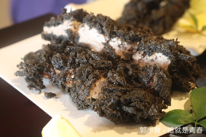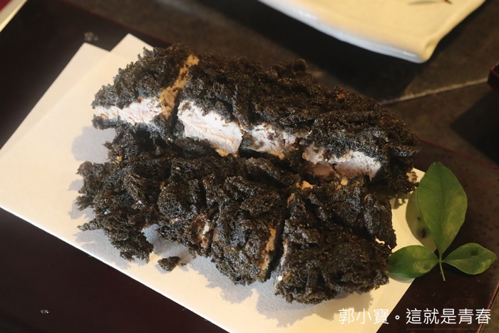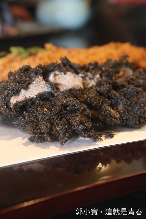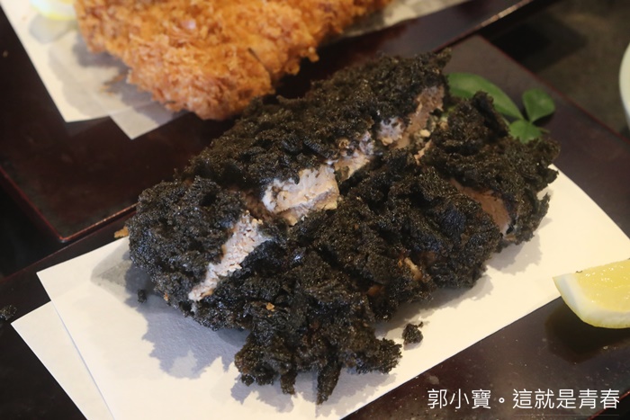 端上來的時候真的是黑嚕嚕的一大塊,難怪被稱為臭火搭料理,感覺就像是燒焦的豬排,但是還是可以看到裡面白嫩嫩的腰內肉,這次就點了黑豬排跟正常豬排,腰內肉跟里肌肉各點一份來試試看這六白黑豚的滋味。