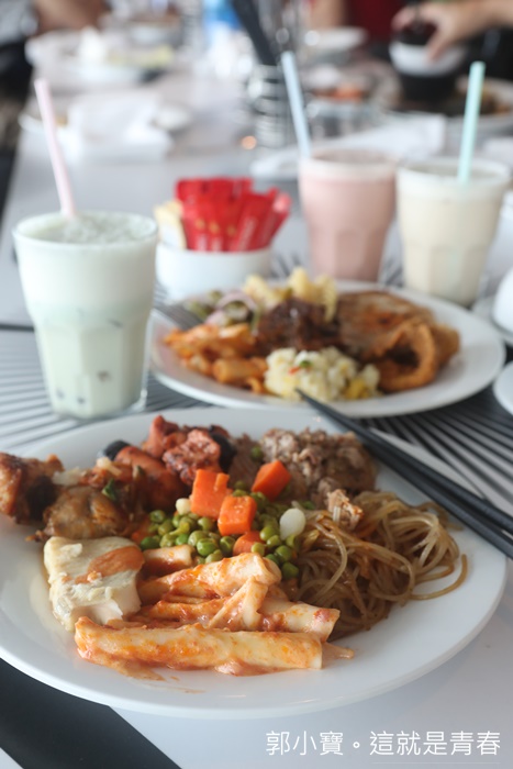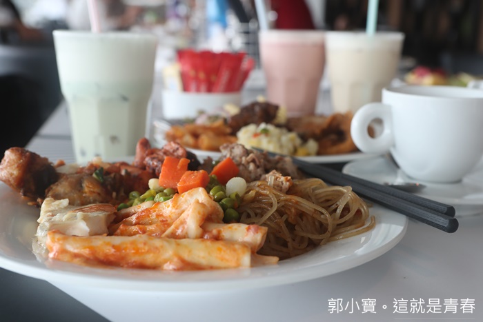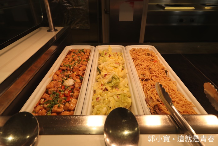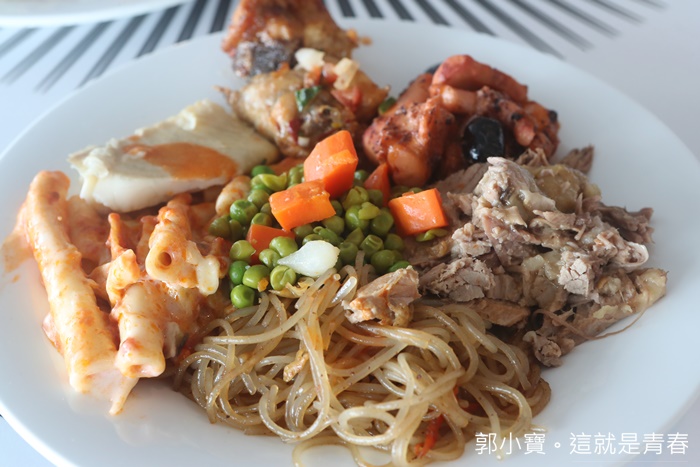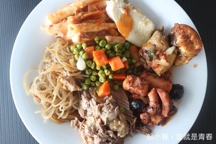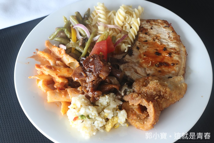 | 看看這滿滿三大盤的菜色幾乎都是不一樣的,豬排肉每一餐我都一定會夾,因為真的嫩口多汁又好吃,還有很多中式肉類的作法也很推薦,加上用餐環境選擇性多,每一餐都可以換到不一樣的環境,搭配海洋景色真的超開心,而且我們的用餐時間有時候一吃下來舊鈔久的,因為就一直吃一職聊天超歡樂的XD |