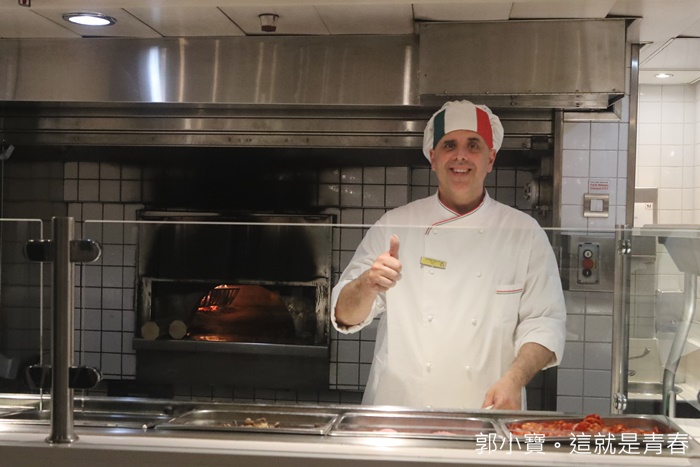 | 看看這全球獨一無二的船上明火設備,想在船上吃個熱騰騰明火烹煮出來的食物就只有在歌詩達新浪漫號上才可以品嘗到了,正統的義大利披薩師傅人都好和善,這邊晚上幾乎都是遊艇上的船員跟工作人員放鬆最佳去處,要看外國帥哥晚上來這邊準沒錯,晚上搖身變成批撒餐廳後點披薩的部分是需要另外付費的,價位其實也不會很貴。 |