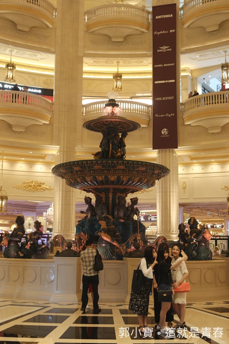 | 最多人拍照的地方大概就是巴黎人大廳的圓環水池,簡直就是把巴黎的工藝水準完整的復刻過來澳門了,貞的一整個就是超華麗的,加上巴黎人還用了很多外國人穿著巴黎傳統服飾,成功營造出巴黎風情。 |