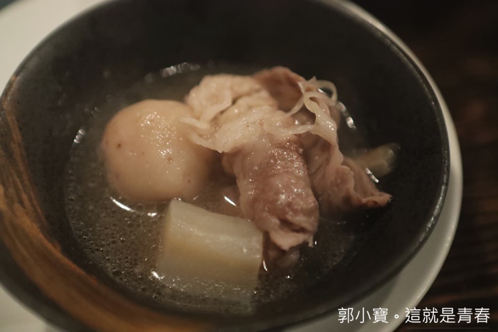 | 這一鍋是山形縣的鄉土料理芋煮鍋,裡面除了米澤牛以外還有其他食材,米澤牛的口感非常嫩口以外,油脂的部分也非常甜。 |