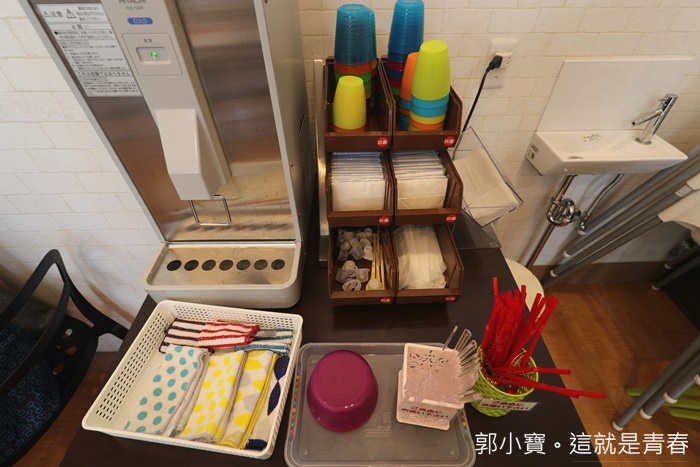 | 水杯跟餐具都在一旁的桌子上,吃完冰的時候也麻煩要自己把餐具拿到收納區。 |