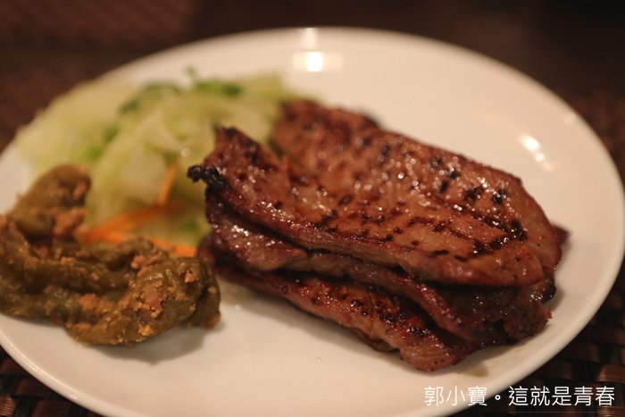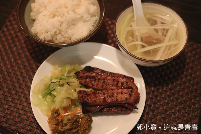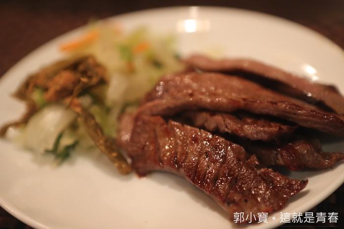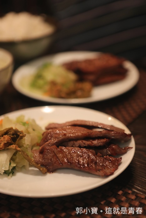 | 我們點了兩種口味的牛舌定食,一個是醬烤一個是塩烤,照片上的牛舌是醬烤所以顏色看起來較深了許多,牛舌都是切成條狀還滿少見的,份量也滿足夠的,吃了一口後我並不是很喜歡這口味,醬烤的部份把牛舌原本的鮮甜肉汁通通蓋了過去,口感的部分好像也沒有很好,但是份量還滿多的,以上樣的份量加上定食套餐整體上來說它們家的價位不算貴。 |