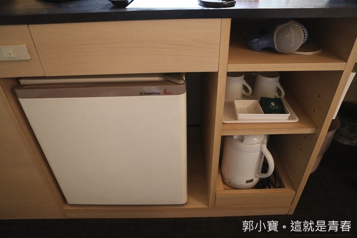 桌子底下有冰箱跟吹風機、茶包跟咖啡包通通都有,吹風機也是放置在桌子底下。