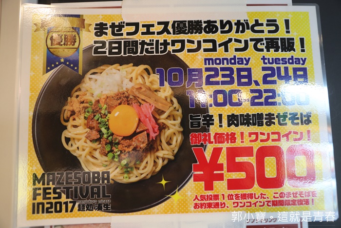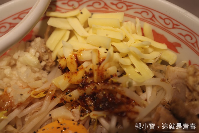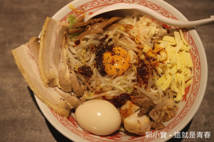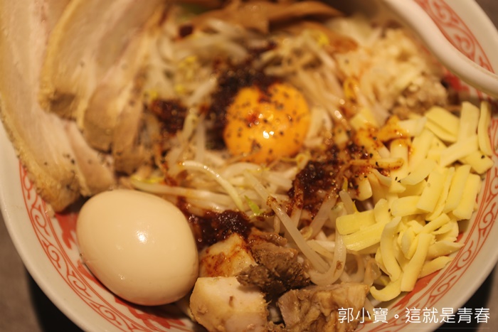 | 我個人覺得光是吃這些配料就可以很飽了,但是看到這一碗我真的覺得超划算的,這樣一碗拌麵只賣1030日幣確實算是便宜,而且我只點中盛不敢免費升級大盛,我這次點的是拌麵,他們的最招牌商品也是沾麵跟背脂豚骨拉麵。 |