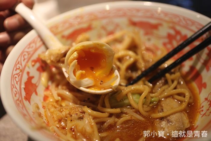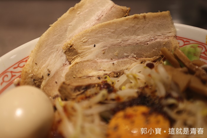 | 一送上來就感覺確實是特製的,料也太多了吧,特別的是還有起司條,旁邊一顆溫泉蛋以外中間還有一顆生蛋黃,豬肉的部分除了有叉燒以外還有豚角、豆芽菜、筍乾等等超級豐富的。 |