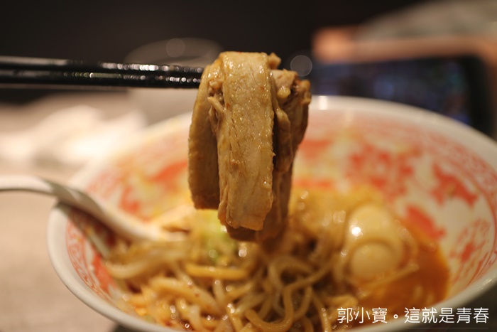 | 豬肉非常好吃,因為特製的有叉燒有條件也有塊狀的豬肉,吃起來的口感都不一樣,一碗拌麵可以享受那麼多種口感非常特別,半熟蛋的熟度我也覺得還不錯。 |