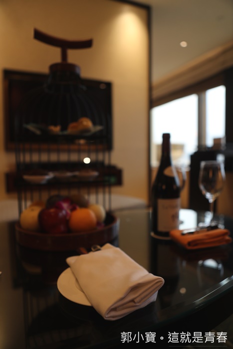 | 前面的小桌子有工作人員幫我們準備的水果跟點心,另外還有贈送我們一瓶紅酒,這些東西要看你訂房的等級,並不是每個房間都有贈送,訂房的時候可以事先詢問清楚,躺臥在這沙發上慵懶的休息喝杯紅酒吃點水果真的很愜意。 |