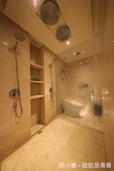 | 淋浴間有沒有發現不一樣的地方,沒有錯,連淋浴間都有兩個蓮蓬頭,戀人一起洗澡的痛苦就是沖水兩個人要互搶蓮蓬頭,悅榕庄的貼心在於此,連淋浴間都考慮完整兩個人使用起來的便利性。 |