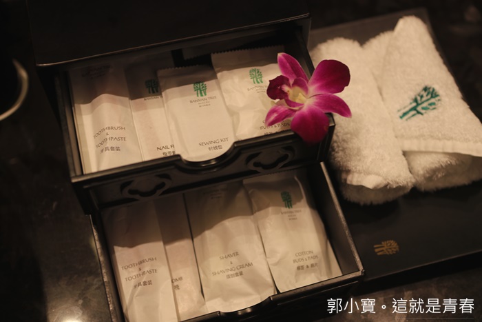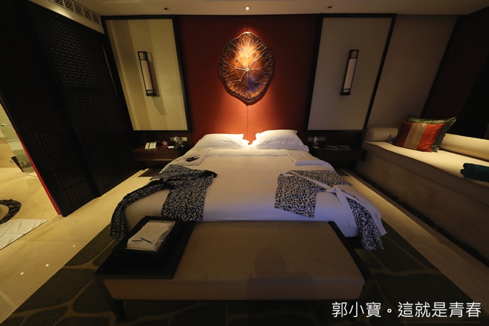 | 吃完晚餐回到房間工作人員就幫我開好夜床了,該補的礦泉水,弄亂的床單被套,用過的毛巾通通整理的跟剛入房一樣乾淨,還幫我們把睡衣放到床上,悅榕庄的睡衣很好看,也是經過巧思設計的。 |