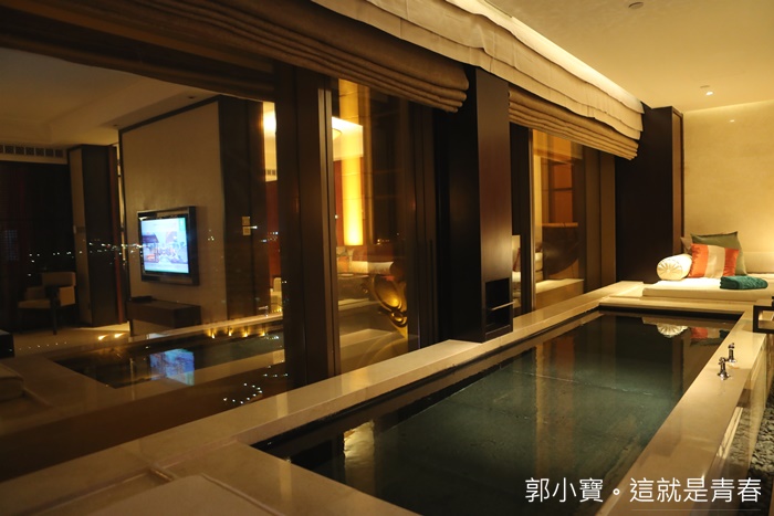 | 這套房的悅心池特色就是貫穿客廳跟房間,非常長的一個悅心池真的很厲害,兩邊都還有懶人亭,一人躺一邊的概念就對了,這悅心池不管白天還是晚上都超級漂亮的,如果你想有情調一點,可以用控制器將紗簾放下來。 |
