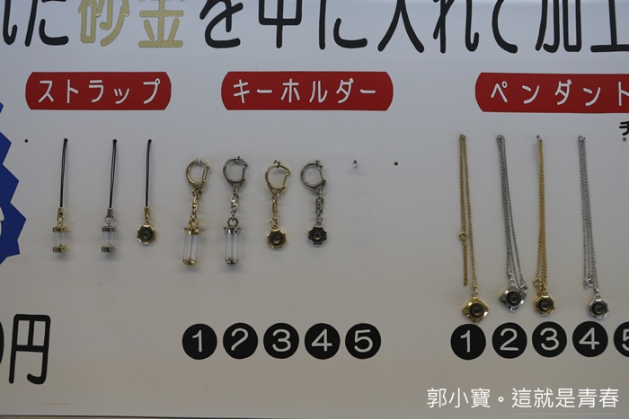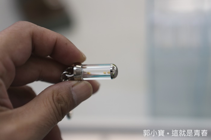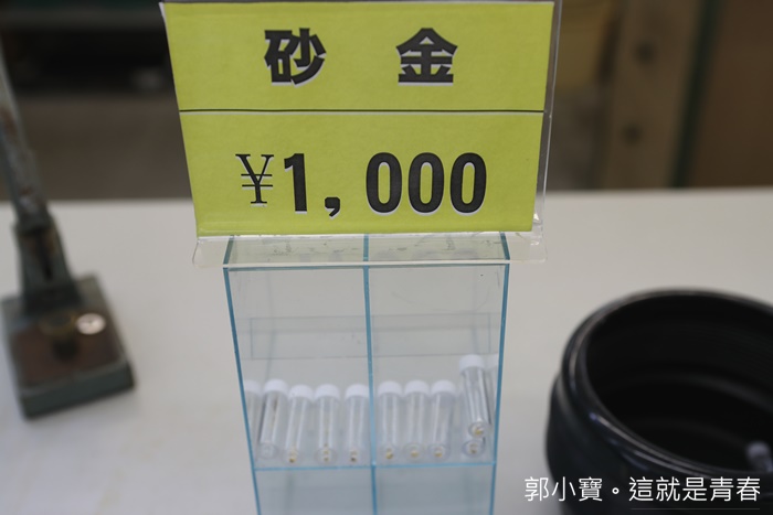 | 將掏完的砂金放在罐子內就可以帶回家當紀念品,妳也可以到櫃檯選購比較漂亮的裝飾物,放在玻璃瓶內當作項鍊或是掛勾,不管你選甚麼都是很棒的紀念品。 |
