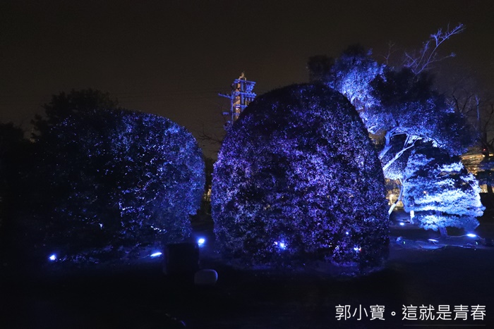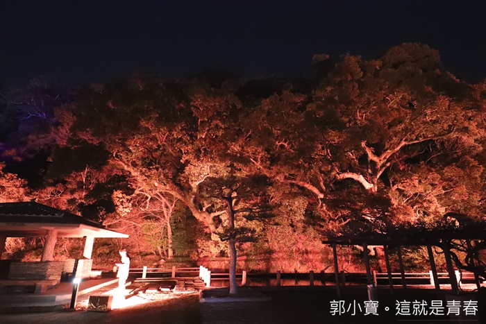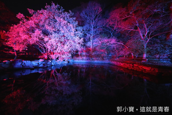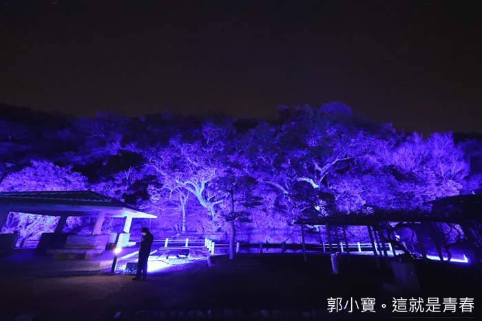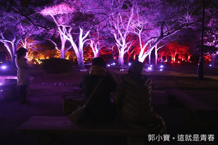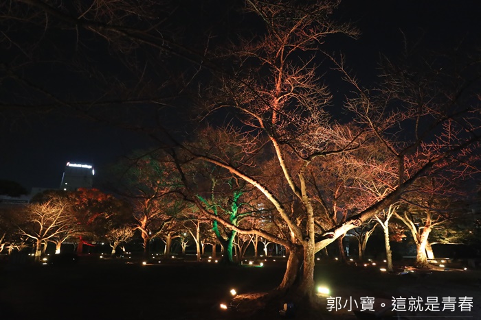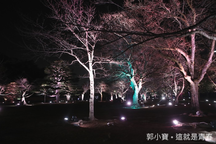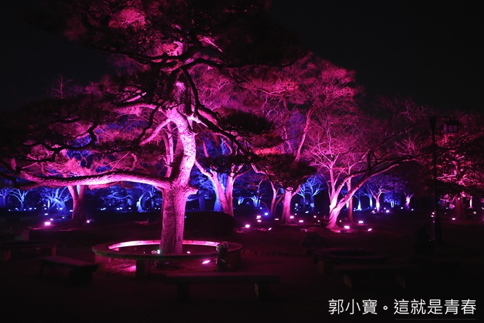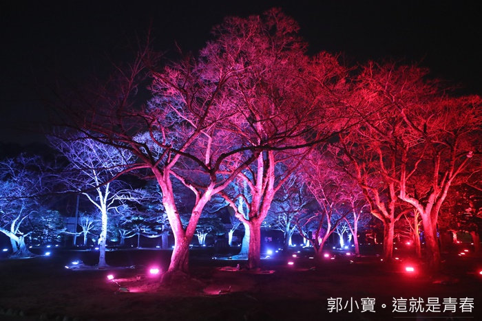| 德島市民們的生活中心城山公園也是這次LED數碼藝術祭的重點,將這一大片的公園在晚上給予了另一種生命,城山公園占地遼闊,隨著反射燈感應附近有沒有人行走或是駐留來變化樹林的顏色,雖然有幾個顏色讓人覺得頗為陰森,但是因為藝術祭的關係所以人潮還滿多的,所以一點都不會覺得恐怖XD |