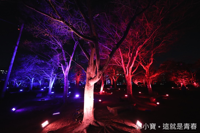 | 這個展區也是很多情侶約會的地方,坐在這長椅上喝著熱茶,欣賞這一整片樹林的聲光效果談天說地真的非常的愜意。 |