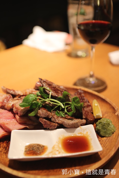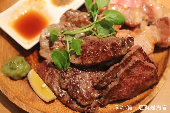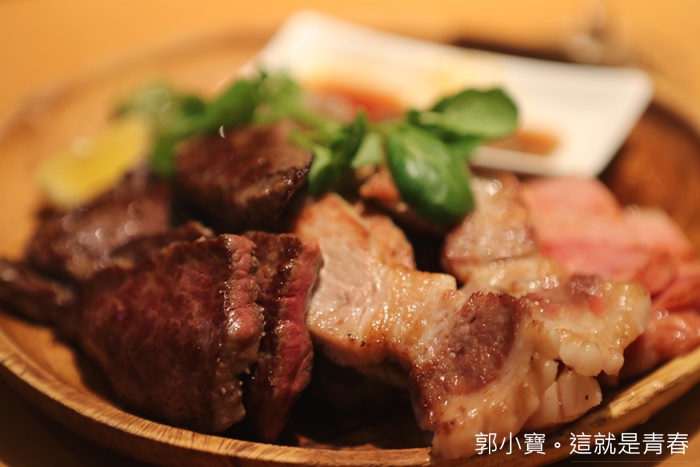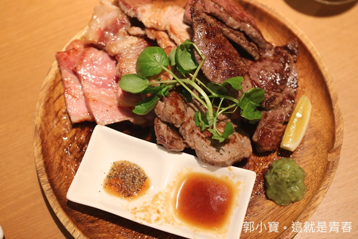 | 這麼一大盤肉端上來的時候簡直讓人食指大動,四種肉品看起來都很好吃,分量感覺還不少,附上兩種沾醬跟芥末醬還有一片黃檸檬, |