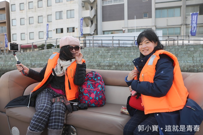| 登上遊艇一樣都要穿上救生衣,但是可以坐在沙發上真的好舒服,我們這艘船這次只有四個人,每個人幾乎都可以躺臥在沙發,這時候如果再來一杯熱咖啡會更好,一整個就像是私人遊艇一般,自拍一整個拍到瘋了。 |