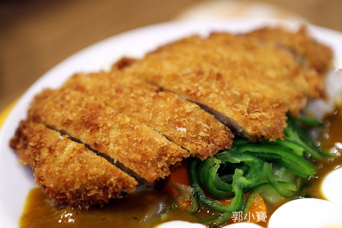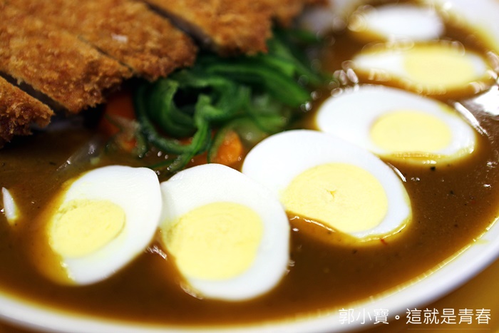 | 看到這端上來的第一眼我就愛上它了,一整個視覺就是超震撼的,滿滿的一大盤咖哩飯飄香四溢,除了香味濃郁以外,還有切片的水煮蛋更顯視覺上的豐富度,超大一塊炸豬排,看得我口水直流,有切片水煮蛋感覺起來就很厲害,雖然它就是水煮蛋,但放在咖哩上面就覺得很舒服。 |