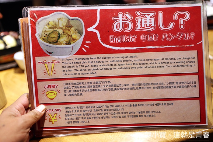 | 另一張菜單解釋為什麼會收小菜費,這是日本的不成文規定,有點像是人頭費的感覺,反正就是付錢就對了XD |