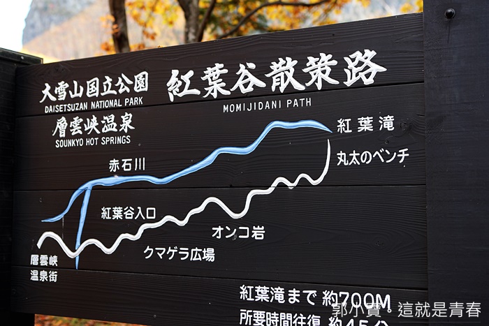 紅葉谷就在層雲峽纜車不遠處,開車大約五分鐘左右就可以到達,紅葉谷散步道最主要是一路走到終點的紅葉瀑布,往返的時間大概要45分鐘左右,加上在紅葉瀑布休息大約預估一個小時差不多。