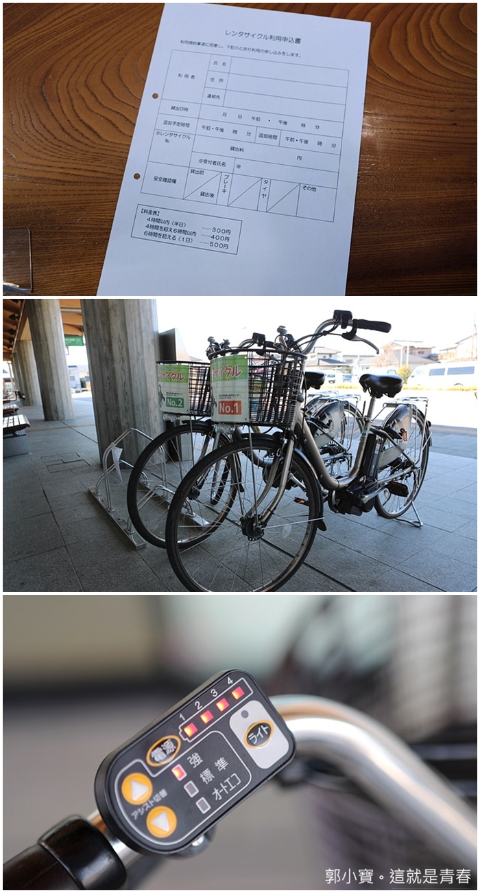 | 觀光案內所內也有租借電動腳踏車,租金非常的便宜,一路踩上坡幾乎超輕鬆,其實我覺得如果不會開車的自由行朋友也可以租借一整天的腳踏車跑行程,有電動腳踏車真的差超多的。 |