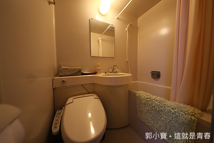 | 玄關房旁的門是浴廁空間, 古良湯之宿 木屋旅館的房間是有分有沐浴間跟沒有沐浴間的,月房是有浴沐間的房型,同樣是一體式浴廁,馬治馬桶跟長形浴缸非常齊全。 |