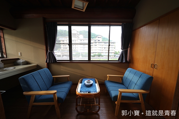 | 藍染的沙發椅超級美,搭配旁邊的窗外景色就好像是一幅畫,老闆的媽媽以前有開設藍染工房,也有再教導體驗,所以早期的旅館名子是藍之宿,後來才改成古良湯之宿。 |