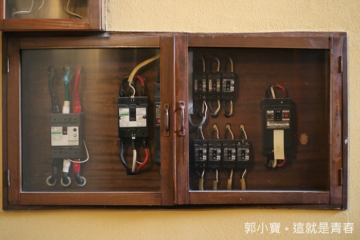 | 走出房門要去逛街的時候,發現通道上也有很多老物件,通道上就看到超復古的配電箱跟電閘,通道上也都有開窗,也看的到巷弄間的房屋群。 |