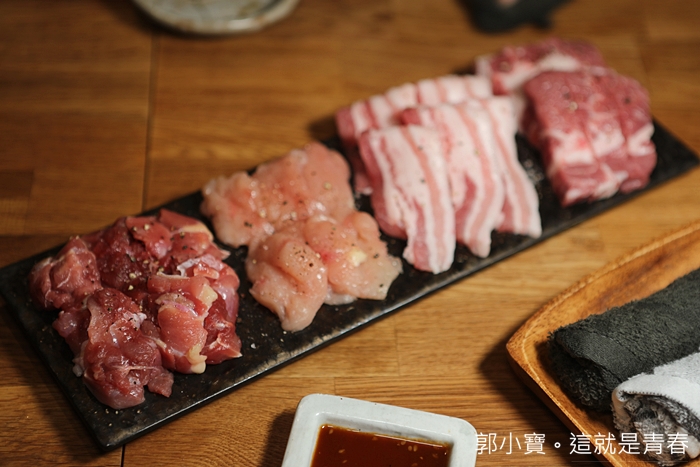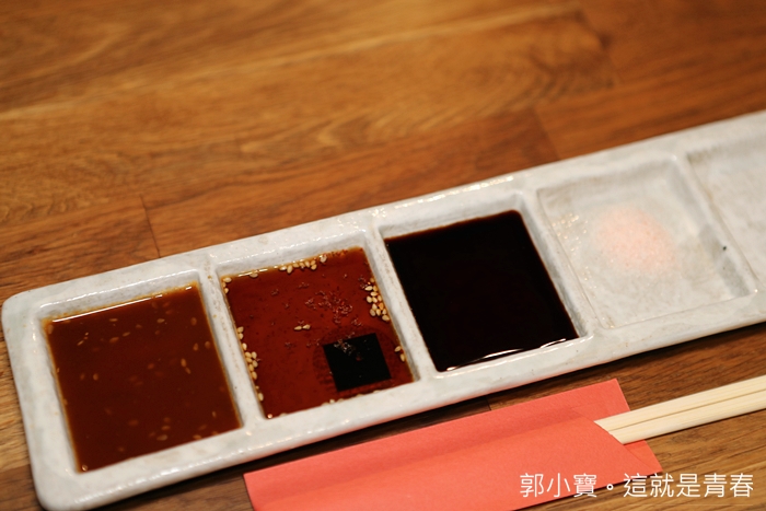 | 我們因為有訂位,所以老闆早早就準備了我們的位子,連醬料都放好了,醬汁從左至右分別為烤肉醬、味增醬油、日式醬油、玫瑰鹽。 |