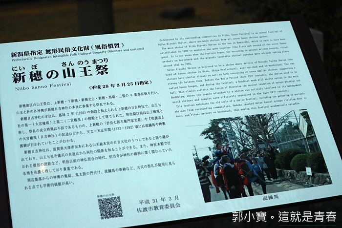 | 新穂にいぼの山王祭是新潟縣指定的無形民俗文化財,每次舉辦就是一連三天,鬼面使者跟鼓童只是其中比較重要的環節,其他還有各樣的祭典。 |