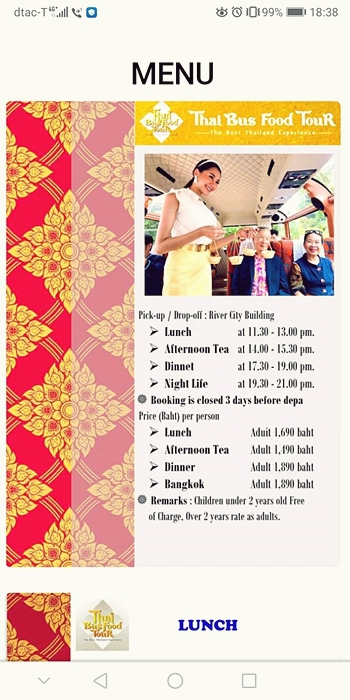 | 目前美食巴士總共有四個餐期,午餐、下午茶、晚餐及消夜,晚餐的餐期是最難預約的,因為可以欣賞黃昏及夜晚的曼谷老城區真的很值得。 |