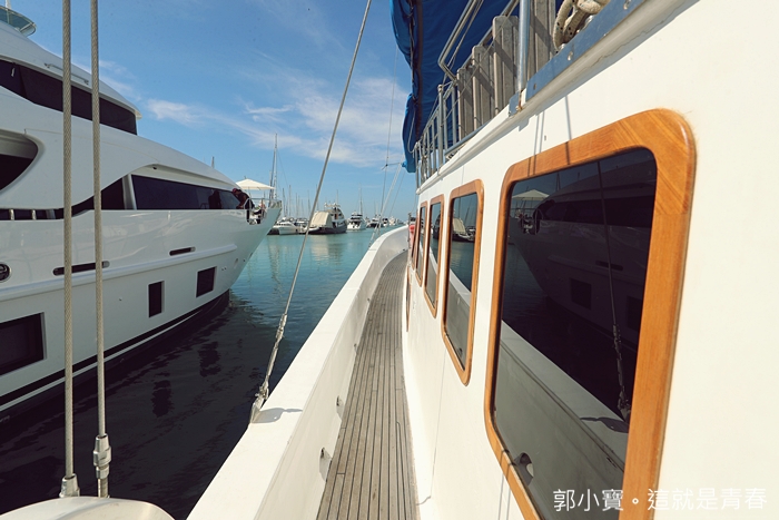 | 我們這次包船的遊艇是這一艘帶點地中海風情的船,主要是很大搜且保留很多空間可以容納高達50個人以上的遊艇,跟一般只能容納20幾個人的遊艇不一樣。 |