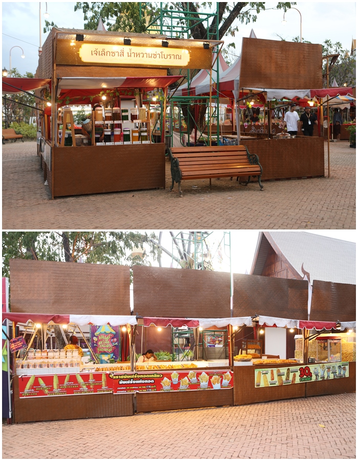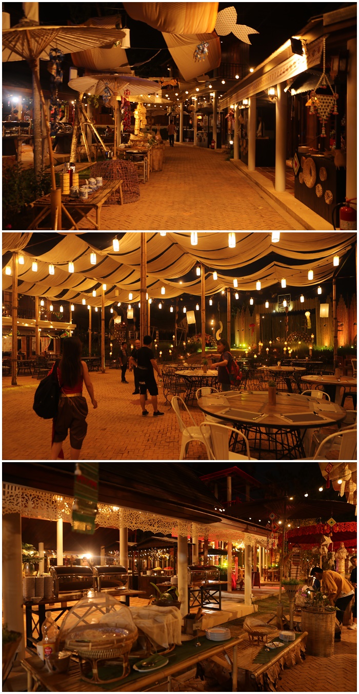 | 沿著廊道前進就可以看到宛如泰國路邊攤的攤販,全部都是自助餐的餐檯,最後面的用餐大廣場及周邊的屋子內桌椅都可以入座。 |