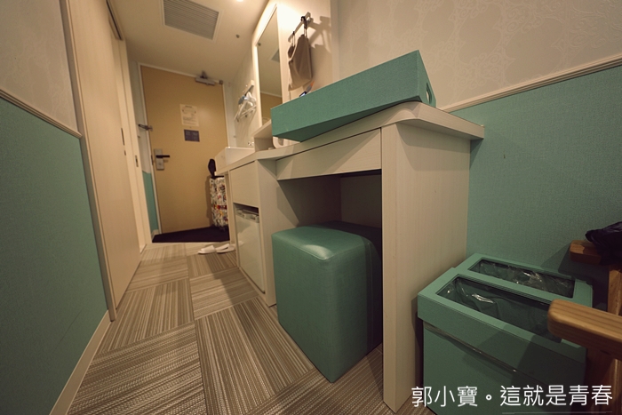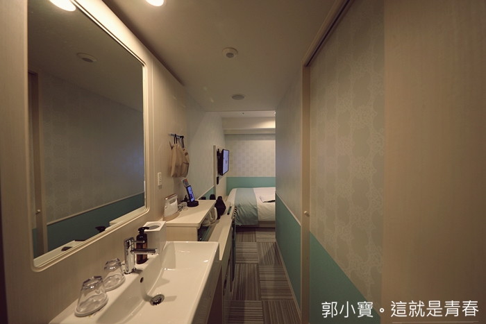 | 打開房門後右邊邊是浴廁,走道的左邊是洗手台,房間感覺小間了一點,但是麻雀雖小五臟俱全,我這次入住的是單人房,於下的空間大概只能頂多再放一個行李箱,打開就完全沒有路可以走了XD |