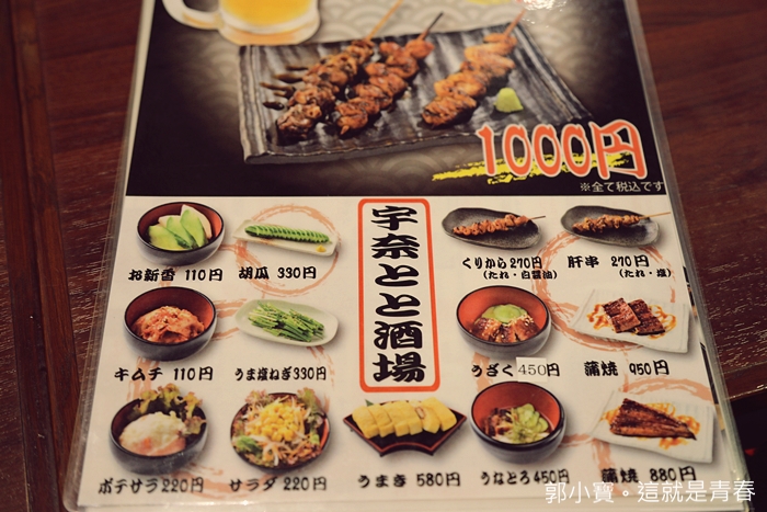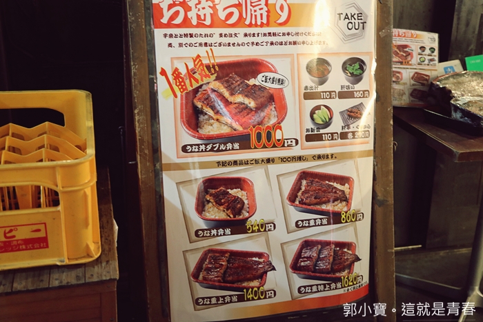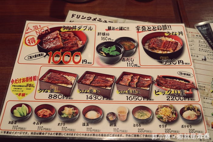 | 看了一下門口的海報,宇奈的鰻魚真的很便宜,我在日本大概吃超過至少50家鰻魚名店,但是幾乎也沒看過那麼便宜的,雖然我知道鰻魚是一分錢一分貨,但是有時候就是不想花大錢又想吃個鰻魚,這時候宇奈就是你很好的選擇了。 |