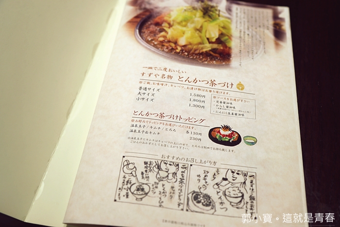 店內最有人氣的就是鐵板炸豬排茶泡飯,從昭和時代就是以這樣單品打響名號,還有其他餐點的選擇也很多,但是我當天大概環顧了一下,好像每個桌子上都有點這一份餐,所以最後還是決定點一份來試試看。