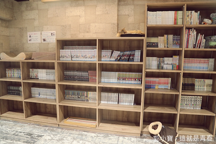 一進入貓空機內有前後兩個空間,兩個空間都有懶骨頭的坐墊,一旁還有漫畫書貴,牆壁都是貓跳台。