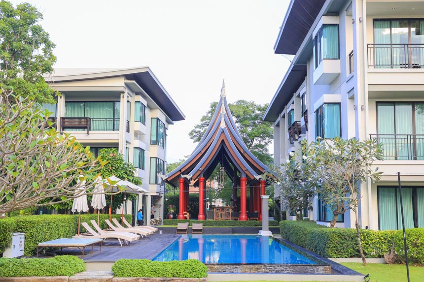 | 早上起床的時候趁吃飯前趕緊來走一走,逛逛整個園區,空氣很好又舒服,一走出門就可以看到這渡假村整理的超乾淨的,明明很泰國但是建築又帶了現代風格。 |