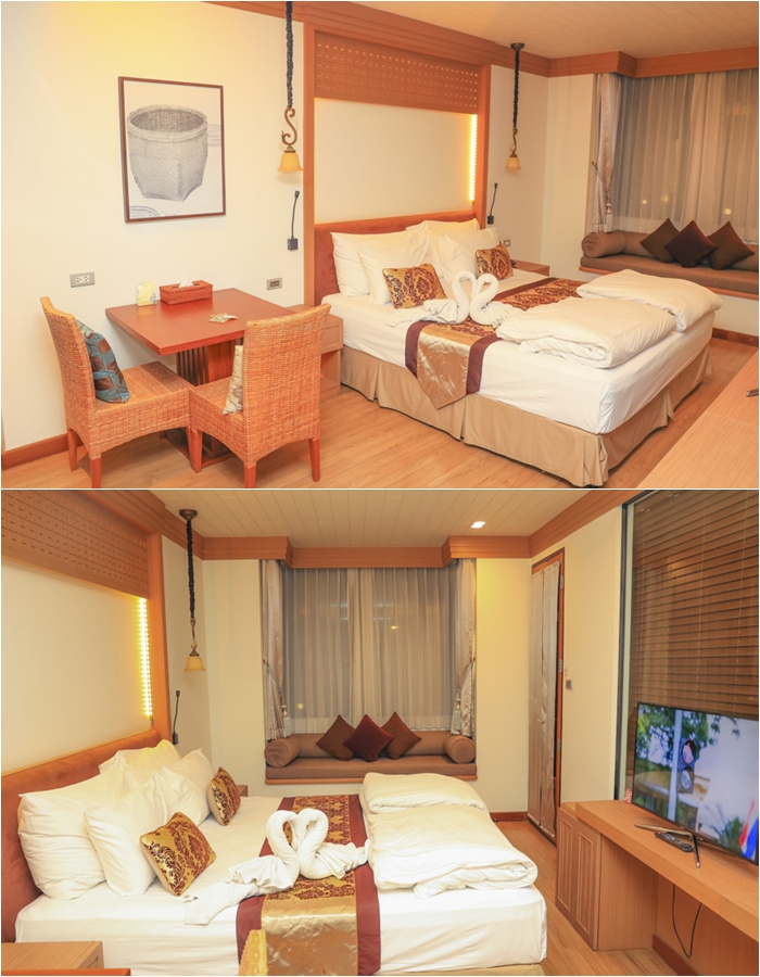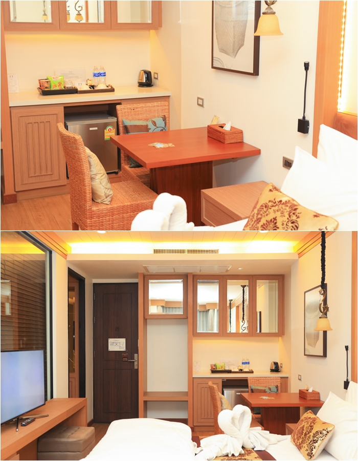 | 一張小桌搭配藤椅就超泰國風了,衣櫃跟茶水櫃是一起的,有點像是小套房的規格,我還滿喜歡這樣的房間,不會空蕩蕩的,有時候房間太大真的很空蕩,這樣的感覺我反而很喜歡。 |