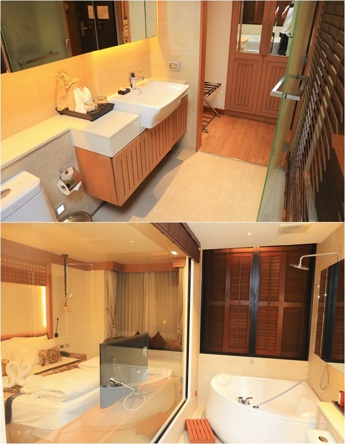 | 備品跟吹風機應有盡有,竹簾一打開就可以看到房間,果然是情侶跟夫妻使用的,就算是情侶夫妻其實光溜溜的洗澡也滿害羞的,尤其上廁所的時候對照更尷尬。 |
