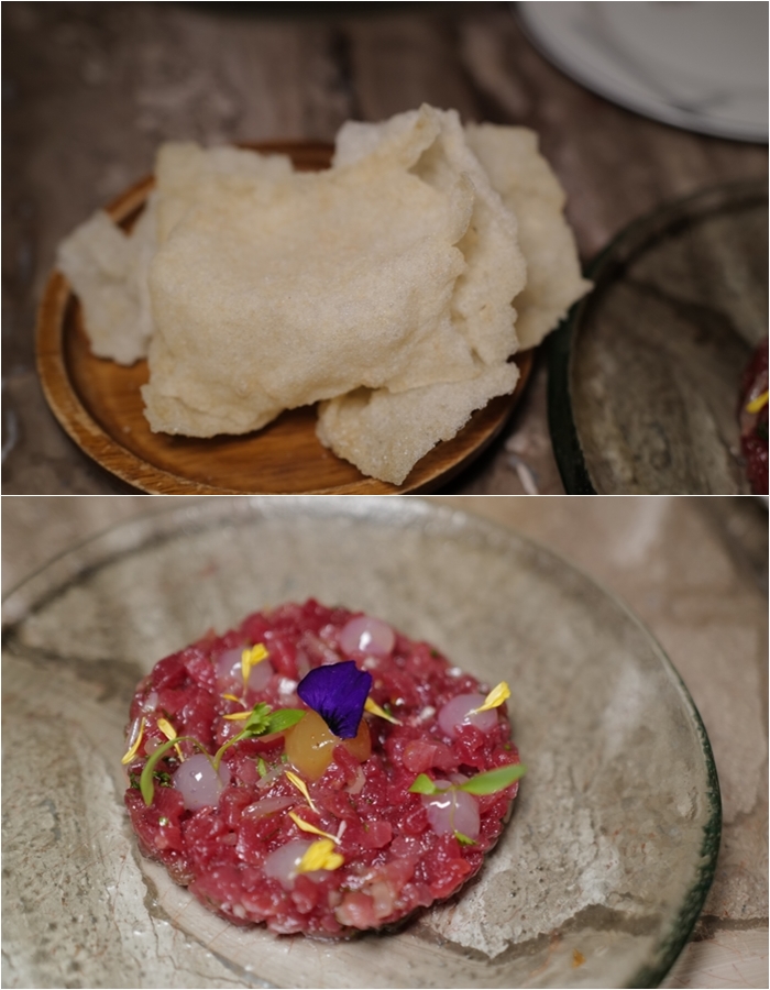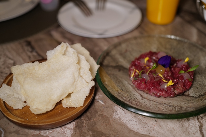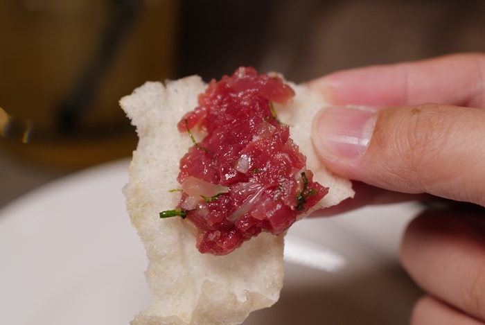 | 薄脆餅讓口感層次加分許多,鮪魚沒有打成泥而是切成碎丁狀,咀嚼中還可以咬到一點咬勁,帶點調味酸度讓魚肉的滋味更上層樓,將這道菜拆開來看,就是葡國式鮪魚壽司的概念,米餅、醋、鮪魚生肉,用另一種視覺及口感跟滋味結合再一起 |