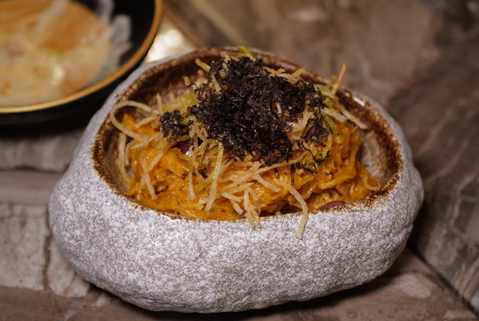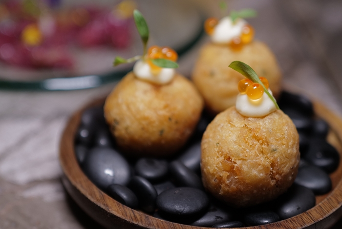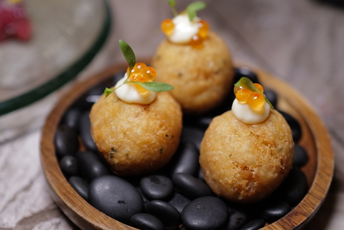 | 在澳門的葡式餐廳跟其他小食餐廳都非常常見到馬介休,馬介休就是鱈魚鹽醃的商品,馬介休上面還有一點酸奶跟鮭魚卵,視覺效果頗為步錯,入口是傳統道地的馬介休無誤,加上酸奶的滋味還有鮭魚卵的逼逼啵啵,增加些許嘴裡的樂趣。 |