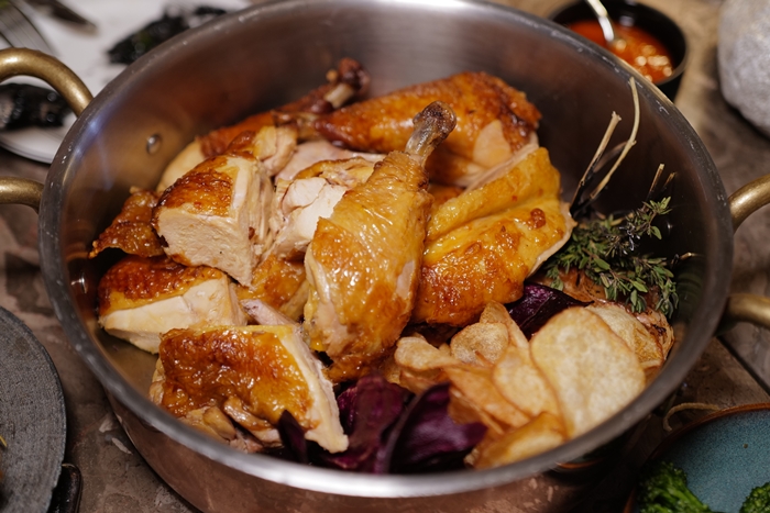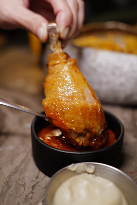 | 搭配主廚特調的兩款醬料,烤雞吃起來鮮嫩多汁,充其量就是好吃的烤雞,醃料有一些不同,但是我覺得最重要的是醬汁的部分,兩款醬汁不同風味,吃起來真的有畫龍點睛的效果,酥辣鹹甜香,都在這兩款醬料充分應用。 |