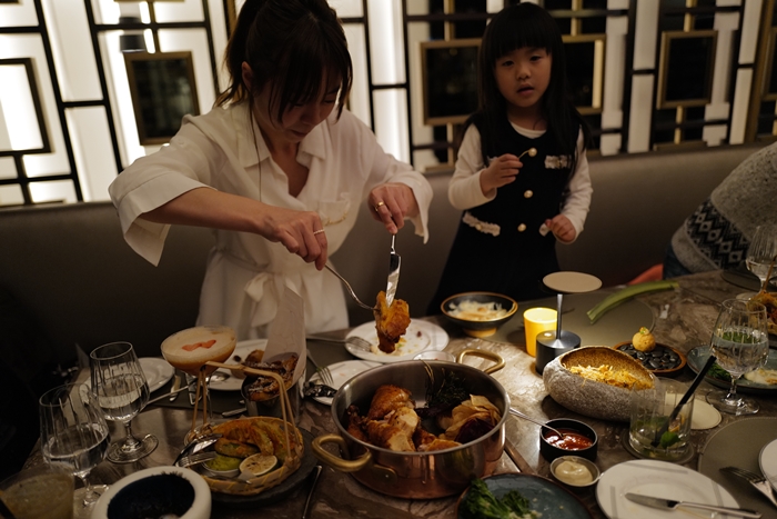 另一邊則是餐廳座位區,座位區有三個區域,感覺都不太一樣,另一邊的座位區有點像是星空區,我們坐的這一區則是一樣走較時尚的區域,除了有長桌是和聚餐以外,也有兩人到四人桌,可應付客人的不同人數需求。