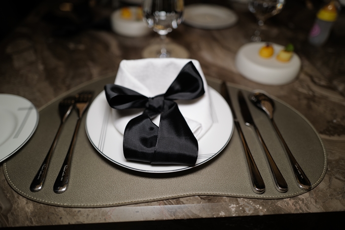 | 皮革餐墊更顯尊貴,我喜歡口布上再打個小領巾的感覺,非常俏皮,當要拿下口布的時候,需要打開領巾後在取下口布,代表來這邊的人也可以完全放鬆,享受美食,這無疑就是代表著老佛爺的精神啊!!! |