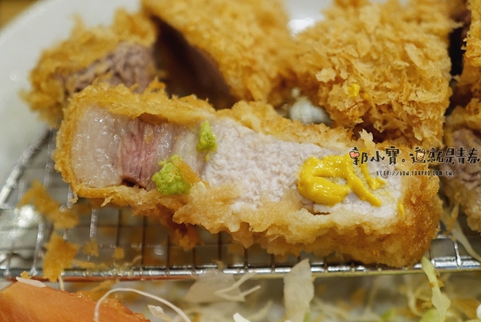 | 太妃吃下一口表示很好吃,連女兒都很捧場,直呼油脂很甜且肉也很嫩,搭配黃芥末更對味,跟太妃夾了一塊來試試看,搭配芥末確實讓油脂的膩感降低很多,吃起來也很清爽,超不油的炸豬排,很不錯呢!! |