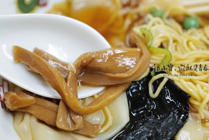 非常經典的配料,光是看到那鳴門魚板就知道了,只有古老的日本拉麵才會被上這鳴門魚板,但也是最多老人家最喜歡的鳴門魚板,搭配一片五花肉跟筍菜乾,這就是昭和時期的老拉麵! |