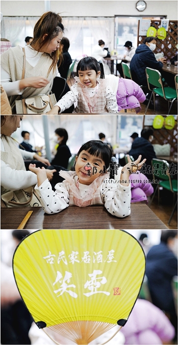 我們剛好被分到四人的小桌子,等待麵食的時間大約五分鐘就陸續上桌了,一個老人家還給女兒一把扇子,看的出來不是它們家的,不知道哪來的XD