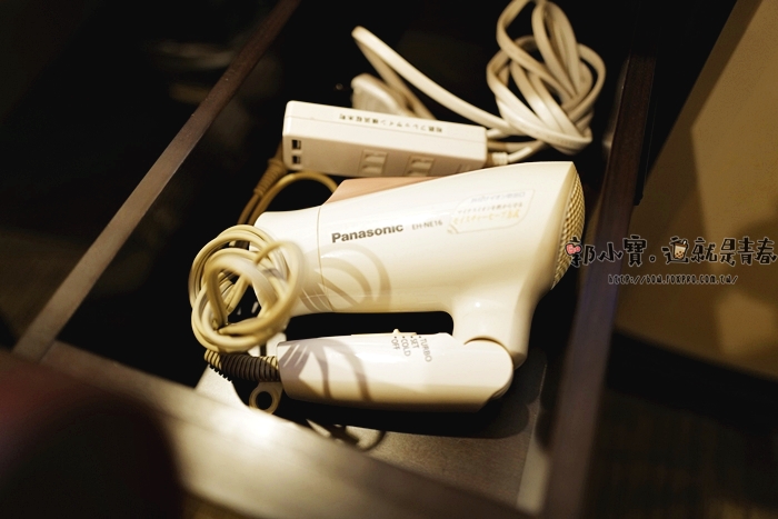 | 抽屜打開來有放吹風機,還附帶一條延長線,吹風機雖然滿好吹的但比較小台一點。 |