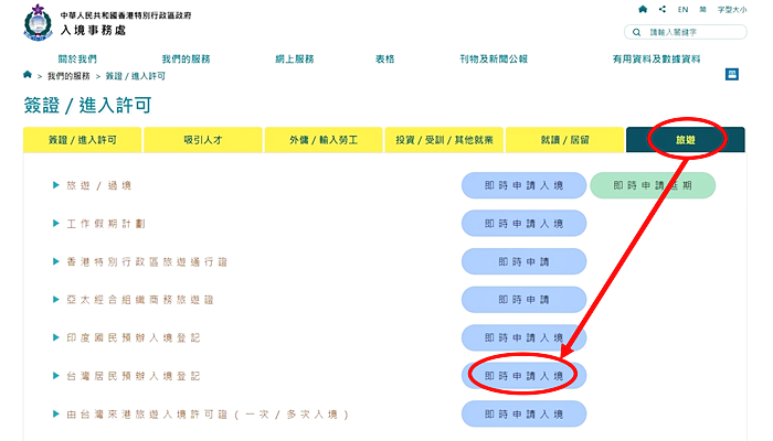 | 再來將滑鼠滑到中間右邊的【旅遊】點一下,在出現的選單中點選【台灣居民預辦入境登記】這項的右邊(即時申請入境)就會跳轉到下一個頁面。 |
