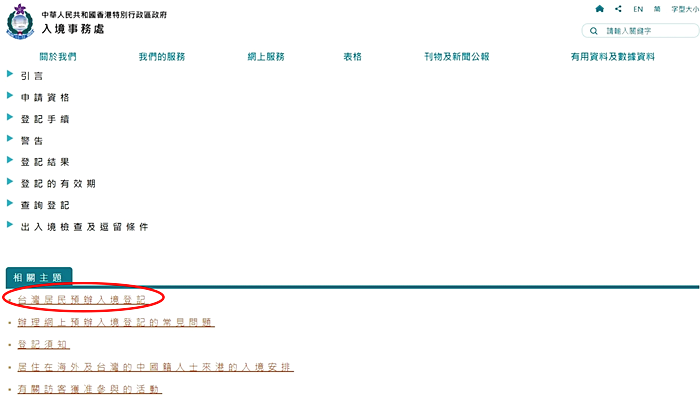 | 在相關主題這邊的第一項【台灣居民預辦入境登記】點它。 |